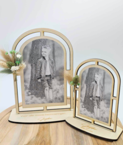 Boog fotohouder met foto en gravering (minimum aantal 8 stuks)
